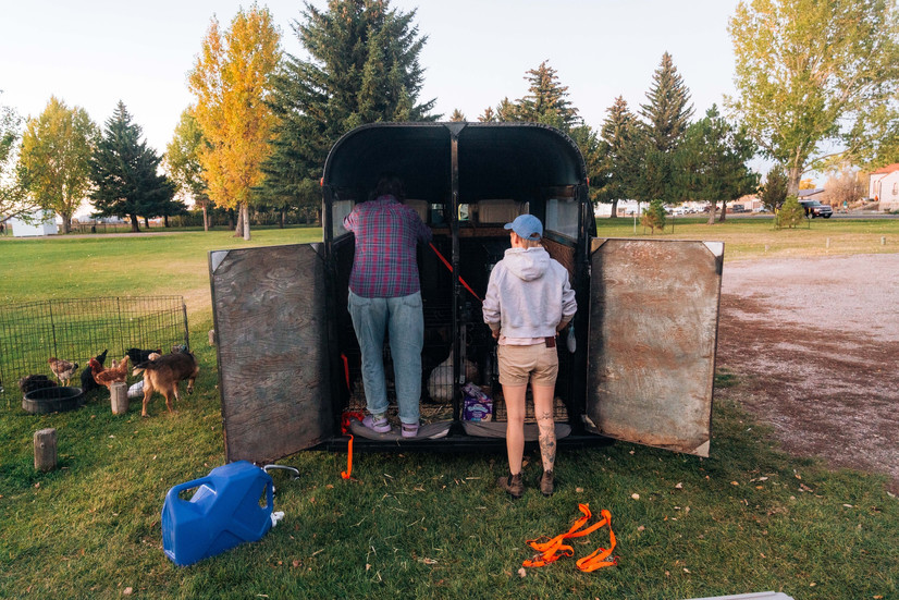 In the weeks leading up to the move, we kept a document with all of our birds listed, and we assigned our chickens to pairs or small groups based on their little quirks, beefs, and personalities. Thanks to the generous community of Two Mom Sanctuary, we had enough dog kennels for each grouping to call home for the ride, stocked with fresh coconut bedding, rabbit waterers (which did not end up working haha), and treats. The night before our big move, we packed them into their crates then stacked and secured them into the horse trailer. The next day, the adventure began.